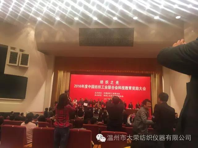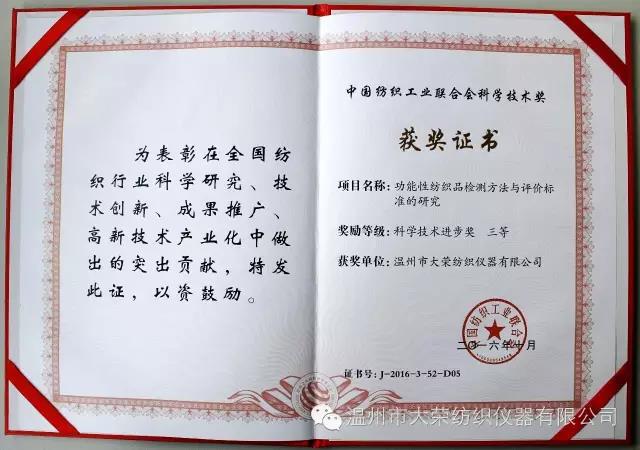 紡織之光2016年度中國(guó)紡織工業(yè)聯(lián)合會(huì)科學(xué)技術(shù)獎(jiǎng)?lì)C獎(jiǎng)大會(huì)今天在北京人民大會(huì)堂召開(kāi)。紡織之光科學(xué)技術(shù)獎(jiǎng)是紡織行業(yè)非常有份量的獎(jiǎng)項(xiàng)。這些最新科技成果的取得和應(yīng)用,帶動(dòng)行業(yè)科技水平整體提升,助力紡織行業(yè)實(shí)現(xiàn)創(chuàng)新發(fā)展。溫州市大榮紡織儀器有限公司同中紡標(biāo)檢測(cè)認(rèn)證有限公司等單位合作的“功能性紡織品檢測(cè)方法與評(píng)價(jià)標(biāo)準(zhǔn)的研究”項(xiàng)目,榮獲科學(xué)進(jìn)步獎(jiǎng)三等獎(jiǎng),這是大榮紡儀首次獲得的紡織之光科學(xué)技術(shù)獎(jiǎng),大榮紡儀將再接再厲,爭(zhēng)取下年度獲得更好成績(jī)。