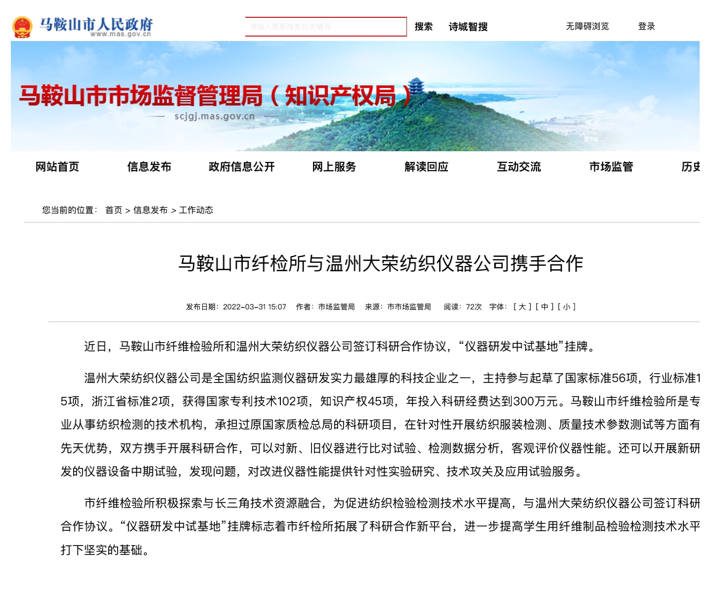 近日,馬鞍山市纖維檢驗所和溫州市大榮紡織儀器公司簽訂科研合作協(xié)議,“儀器研發(fā)中試基地”掛牌。