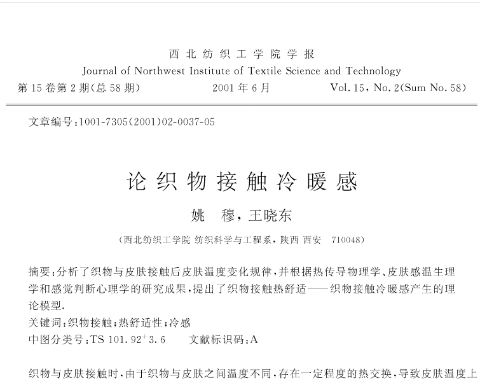 隨著人們對于服裝的要求也越來越高,逐漸從過去的御寒避羞逐漸朝著多樣性、舒適性、功能性的趨勢發(fā)展。 未來逐漸會(huì)從服裝的款式、色彩、圖案印花轉(zhuǎn)移成對穿著感受、實(shí)用多功能、同步環(huán)境變化的趨勢變化。 而涼感勢必是未來紡織面料發(fā)展的大勢頭,這一點(diǎn),早在十多年前,我國著名紡織方面權(quán)威專家-姚穆院士就已經(jīng)開展了分析與研究。